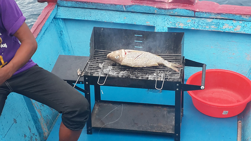 =>줄낚시로 잡은 물고기를 바로 바베큐로 슥......
